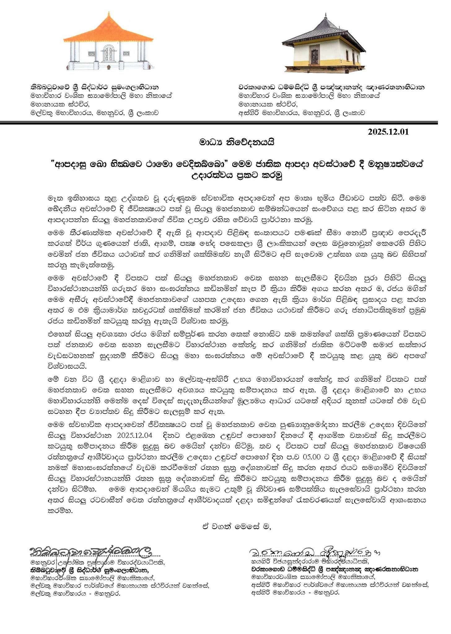මල්වතු හා අස්ගිරි මහා විහාරීය මහානායක මාහිමිපාණන් වහන්සේලාගේ මාධ්ය නිවේදනය.